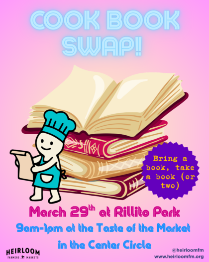 - March 29th, 9am to 1pm – Cookbook Swap! Join us for our very first Cookbook Swap at the Rillito Park Farmers Market! Bring a cookbook (or a few!) to share, and head home with fresh inspiration for your kitchen.