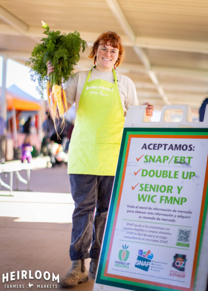 Heirloom Farmers Market Market Ambassador Program helps SNAP, WIC & FMNP Senior customers shop, cook, and eat locally. Thanks to the support of our sponsor, Arizona Complete Health, the Market Ambassador Program has the opportunity to continue serving the southern Arizona community. Cipora serves as the Market Ambassador at the Rillito Park Farmers Market and can be easily identified by her bright green apron while she assists customers throughout the market.