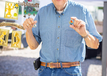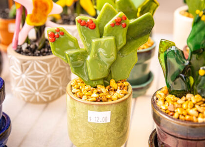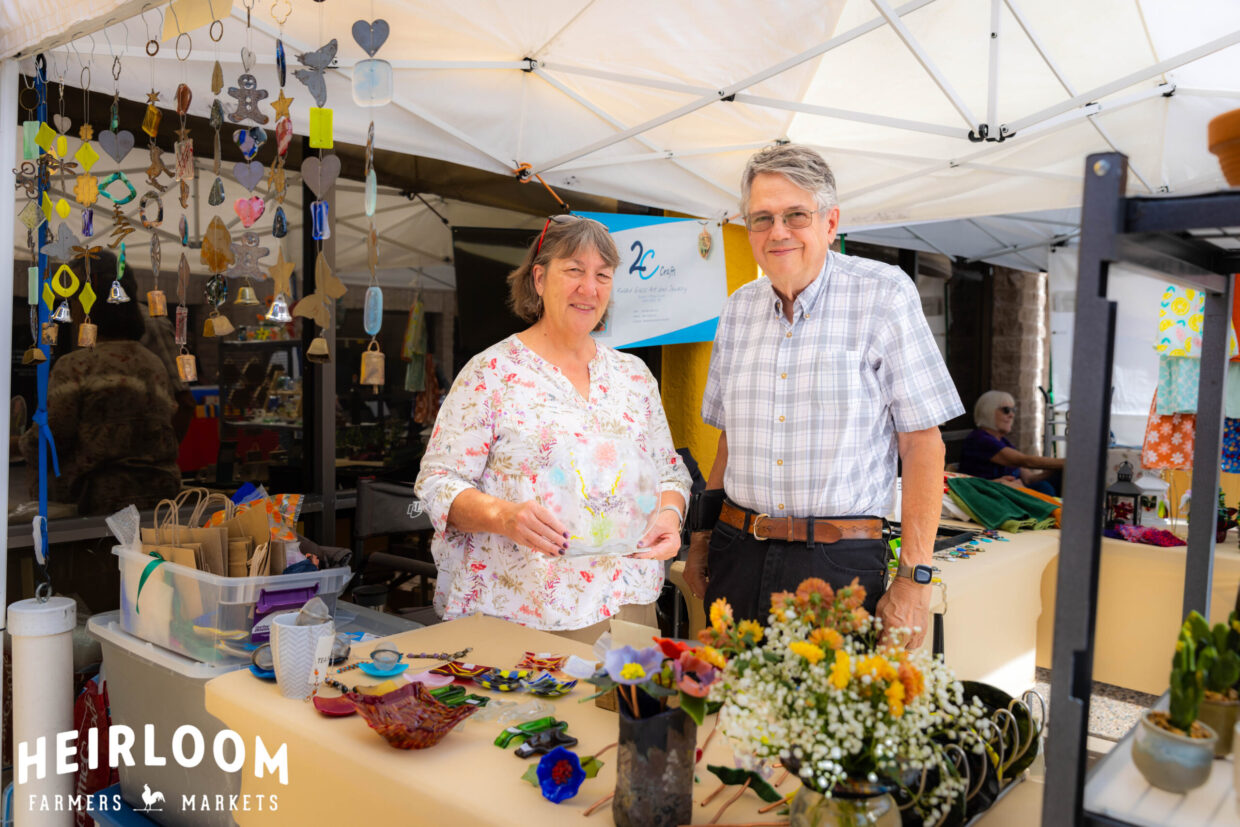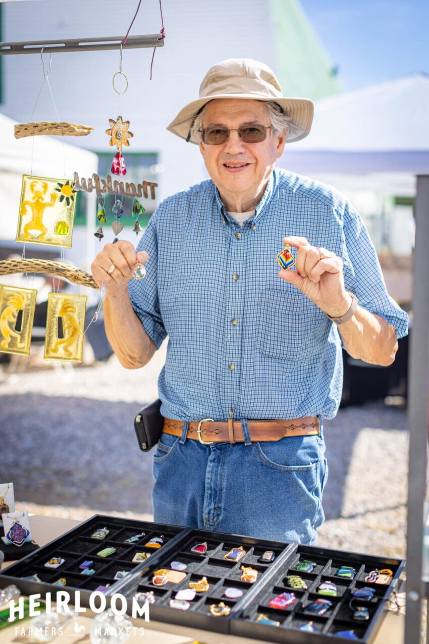 Fused glass art, fused glass plates/bowls, soap dishes, glass business card holders, fused spoon rests or serving platters, fused dichroic glass jewelry, glass-adorned purse holders, and some wire-wrapped gemstone jewelry.