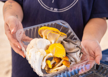 Our farm produces a rotating variety of fresh gourmet mushrooms, mostly centered around tree-borne species that grow in colder, wetter climates – but here locally in Southern Arizona! We produce everything indoors using modern controlled environment agriculture techniques and practices. Basically, we’re a modern indoor mushroom farm. By carefully adjusting temperature, lighting, and humidity, we can simulate the natural growing conditions of many kinds of mushrooms that grow in higher elevations and different regions of the country.