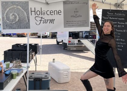 Holocene Farm is a market garden near Benson, Arizona specializing in growing diversified fruit and vegetable varieties that have been well researched and selected for superior flavor, texture, and overall culinary quality. Soil health and ecology is at the heart of their mission. Holocene Farm believes that soil health, plant health, and human health are all direct reflections of one another. It is owned and operated by Molly Shanahan, who manages the shared farmers market booth for Holocene Farm and SouthWinds Farm.