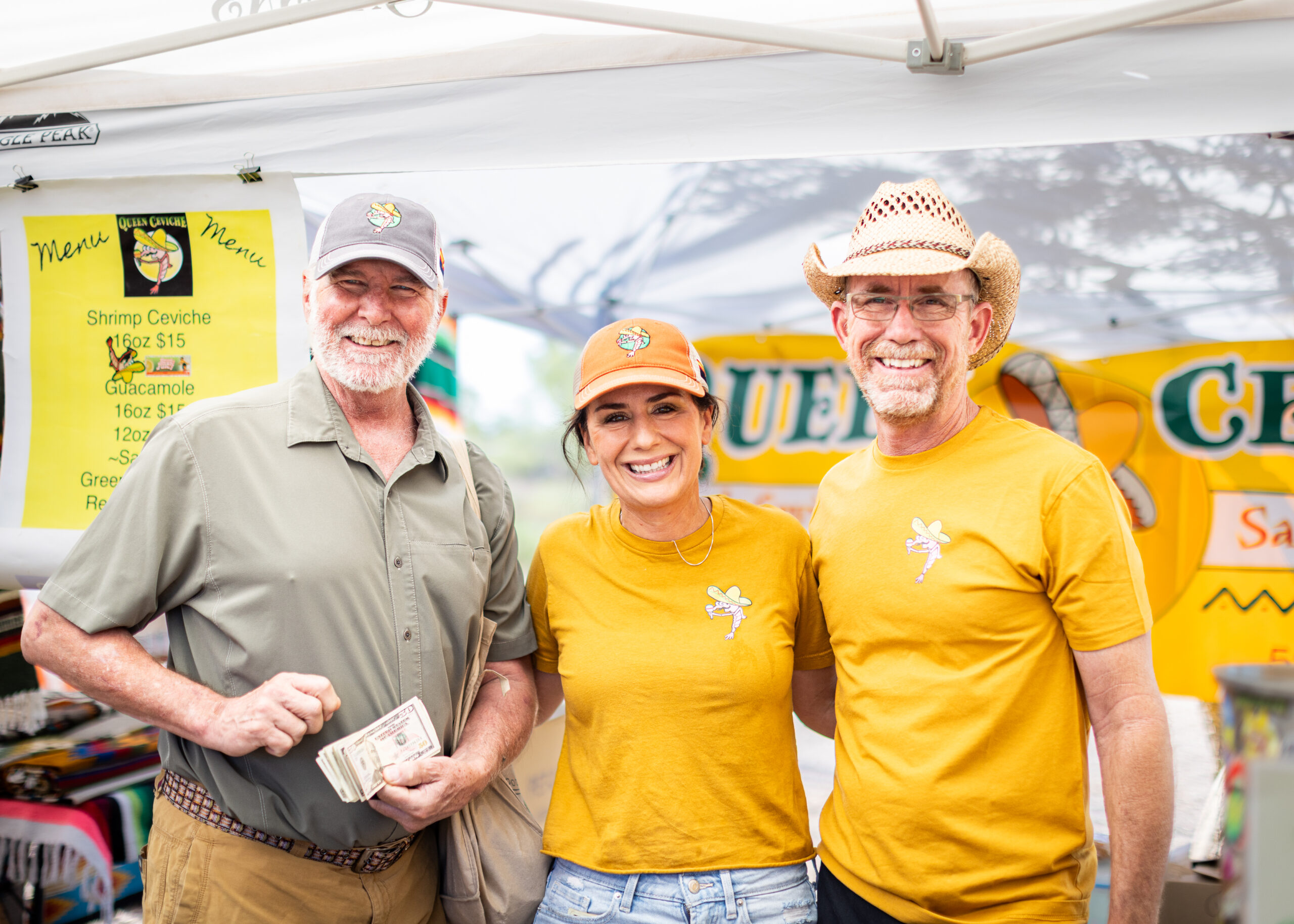 Fresh shrimp ceviche and salsas, chips, hibiscus lemonade, syrup, local pistachios, and local hibiscus body care.